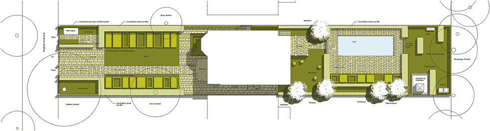weiter. Sandsteinplatten und Buchsbaumkissen werden Pool begleitend